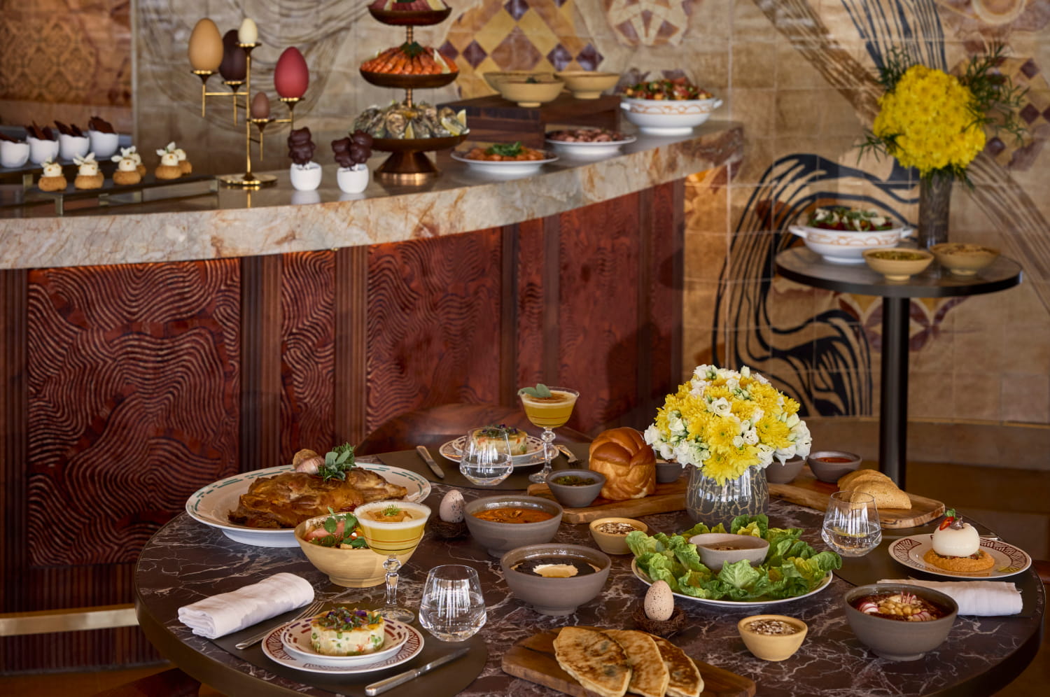 Pour Pâques, Le Rooftop se transforme en jardin suspendu et convie ses hôtes à un voyage culinaire inspiré. Dans une atmosphère conviviale, un brunch aux saveurs du monde mêle mets aux accents orientaux, buffet raffiné et service à table, face à un panorama d’exception.